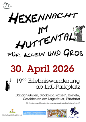 | Do, 30.04.2026 19.00 Uhr bis 22.00 Uhr | Wanderung zum Hexenfeuer im HuttentalWanderung mit dem Nachtwächter über die Speckerbrücke durch den Wald zum Huttental. Dort gibt es Lagerfeuer mit Stockbrot, Geschichten, Rätseln und Basteleien. Für das leibliche Wohl ist ebenfalls gesorgt. | Treffpunkt: Parkplatz an der Speckerbrücke Speckerbrücke 55583 KH-Bad Münster am Stein - Ebernburg www.chnutz.de | ![]() |